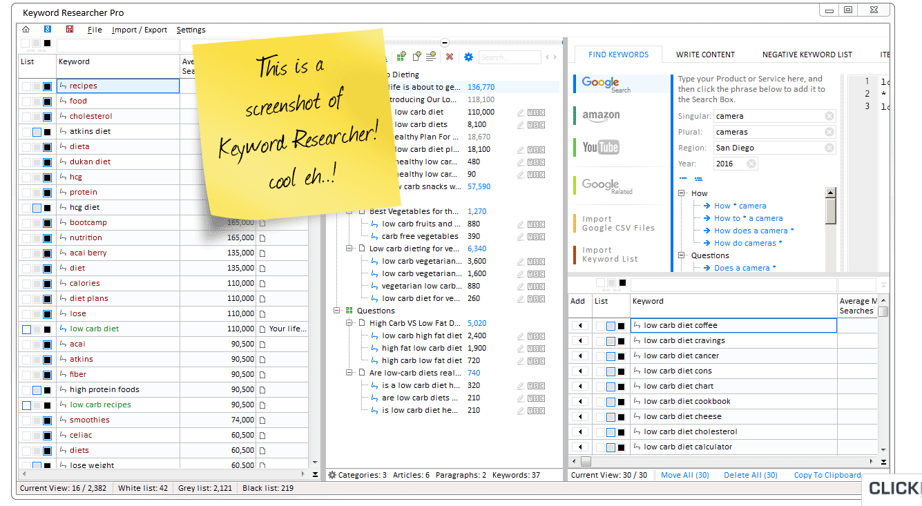 So, the bad ones are out; now you need good ones. How do you find them? Well, Keyword Researcher has several functions you can use to find keywords. You can also combine search functions with features. For example, a “logical expressions” feature would allow you to use more user-friendly phrases.